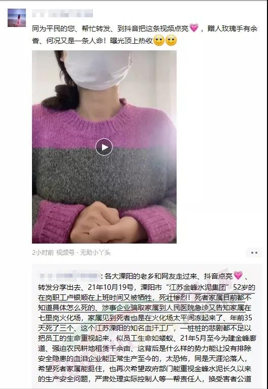 日前,網友“無助小丫頭”發(fā)布消息稱“2021年10月19號,溧陽市“江蘇金峰水泥集團”52歲的在崗職工盧銀順在上班時間又被犧牲,死壯(狀)慘烈!死者家屬目前都不知道具體怎么死的、涉事企業(yè)騙取家屬到人民醫(yī)院急診又告知家屬在七里崗火化場,家屬見到死者也是在火化場太平間凍起來了、年前35天死了三個。21年5月至今為建金峰廊道、強迫農民耕地租賃千余畝,這背后是什么樣的勢力能讓沒有排除安全隱患的血淚企業(yè)能正常生產至今的,同是天涯淪落人,希望死者家屬能挺住,也再次希望政府部門能重視金峰水泥長久以來的生產安全問題,嚴肅處理實際控制人等一幫責任人,換(還)受害者公道。”