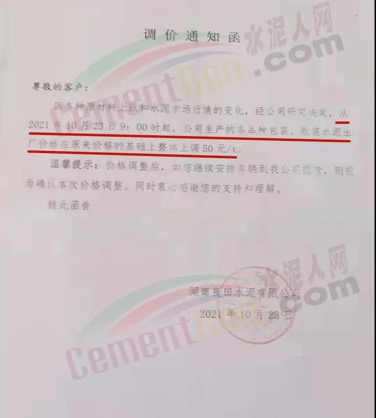 湖南良田水泥有限公司通知,因各種原材料上漲和水泥市場行情的變化,經(jīng)公司研究決定從10月23日9時起,公司生產(chǎn)的各品種包裝、散裝水泥出廠價上調(diào)50元/噸。