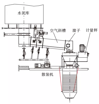 4.保留現(xiàn)有的控制閥門和斜槽,拆除斜槽頭部彎頭和下方的下料管道,保留現(xiàn)有的散裝機,在斜槽頭部加裝專用彎頭,彎頭下方安裝散裝計量秤,散裝計量秤與散裝機連接,更換散裝秤配套的控制系統(tǒng)。實現(xiàn)一次灌裝到位,散裝速度快,計量精度高,提高發(fā)運效率,減小現(xiàn)場揚塵。
