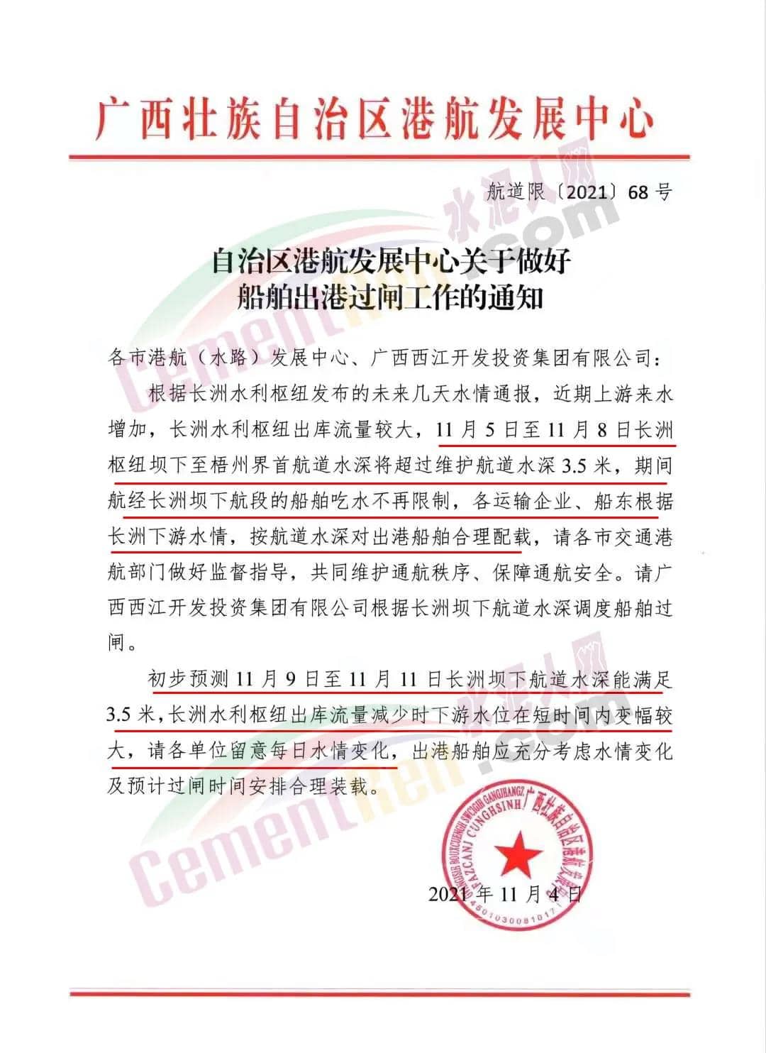 11月4日,廣西壯族自治區港航發展中心發布《自治區港航發展中心關于做好船舶出港過閘工作的通知》給各市港航(水路)發展中心、廣西西江開發投資集團有限公司稱,根據長洲水利樞紐發布的未來幾天水情通報,近期上游來水增加,長洲水利樞紐出庫流量較大,11月5日至11月8日長洲樞紐壩下至梧州界首航道水深將超過維護航道水深3.5米,期間航經長洲壩下航段的船舶吃水不再限制,各運輸企業、船東根據長洲下游水情,按航道水深對出港船舶合理配載。
