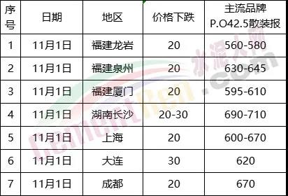 11月4日廣東省部分區域水泥價格漲跌一覽