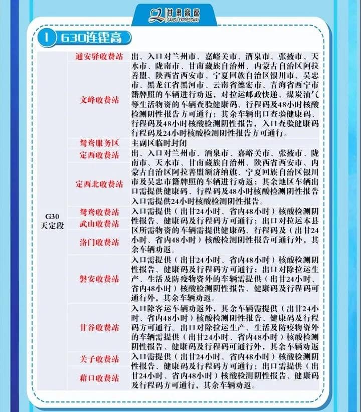 1、G6京藏高速,平西路段平安收費(fèi)站入口車輛監(jiān)測人員登記后進(jìn)入高速;出口車輛持48小時(shí)核酸檢測報(bào)告、掃兩碼后通行,西寧車輛勸返。高寨匝道入口交通管制。