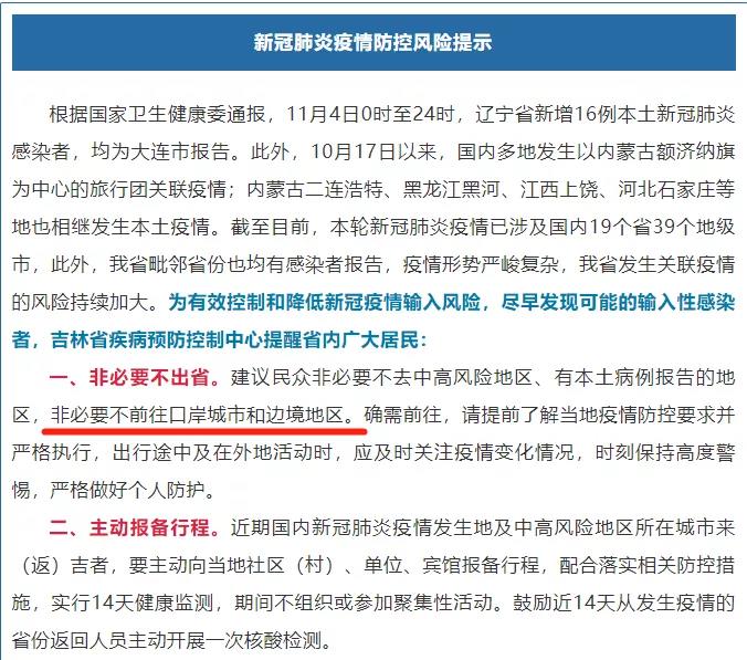 遼寧省政府發(fā)布通知稱,為有效控制和降低新冠疫情輸入風(fēng)險(xiǎn),盡早發(fā)現(xiàn)可能的輸入性感染者,吉林省疾病預(yù)防控制中心提醒省內(nèi)廣大居民:非必要不出省。建議民眾非必要不去中高風(fēng)險(xiǎn)地區(qū)、有本土病例報(bào)告的地區(qū),非必要不前往口岸城市和邊境地區(qū)。