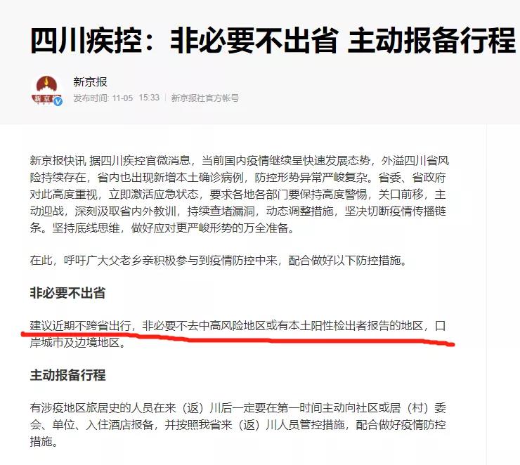 四川省委、省政府建議近期不跨省出行,非必要不去中高風(fēng)險(xiǎn)地區(qū)或有本土陽性檢出者報(bào)告的地區(qū),口岸城市及邊境地區(qū)。