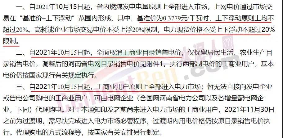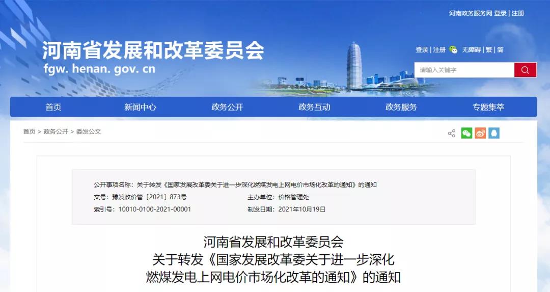河南省內燃煤發電電量原則上全部進入市場,上網電價通過市場交易在“基準價+上下浮動”范圍內形成,其中,基準價為0.3779元/千瓦時,上下浮動原則上均不超過20%。高耗能企業市場交易電價不受上浮20%限制,電力現貨價格不受上下浮動不超過20%限制。自2021年10月15日起,全面取消工商業目錄銷售電價,僅保留居民生活、農業生產目錄銷售電價。自2021年10月15日起,工商業用戶原則上全部進入電力市場。