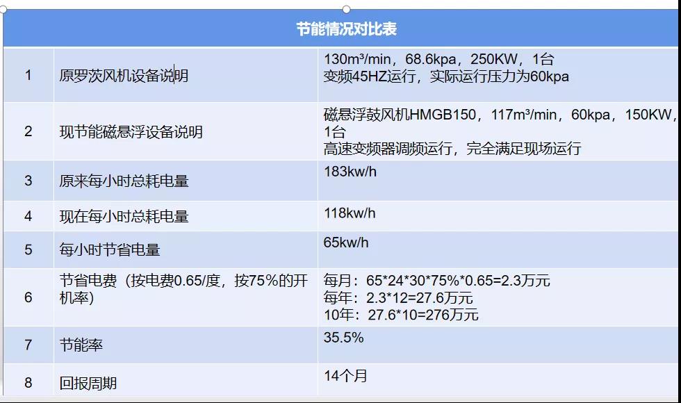 實際運行情況表明,華東風機3臺風機均可達到生產所需風量風壓等要求,運行平穩,噪音低,節能效果顯著,每小時可節省電量65kw/h,節能率35.5%,按電費0.65元/度,75%的開機率計算,平均每月可節省電費2.3萬元。具體節能情況如下表: