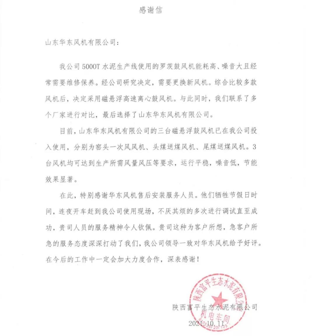 憑借專業的技術團隊、現代化的加工設備、完善的售后服務,華東風機幫助富平生態水泥在提高能源利用效率、降低企業綜合能耗等方面取得了突破性的進步,為此,富平生態水泥特向華東風機寄來了感謝信。