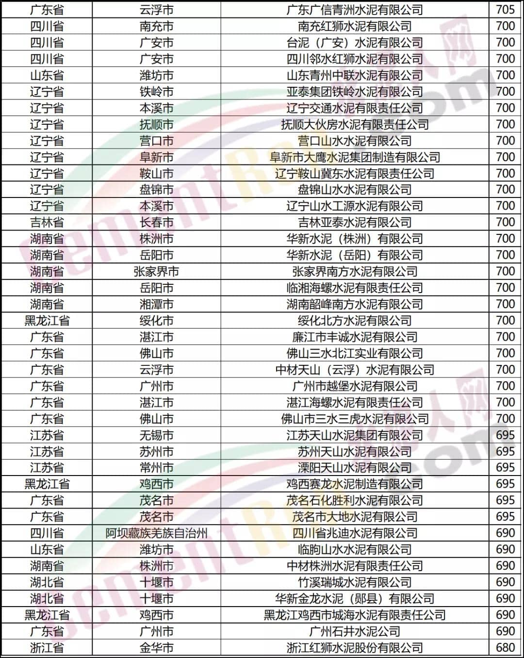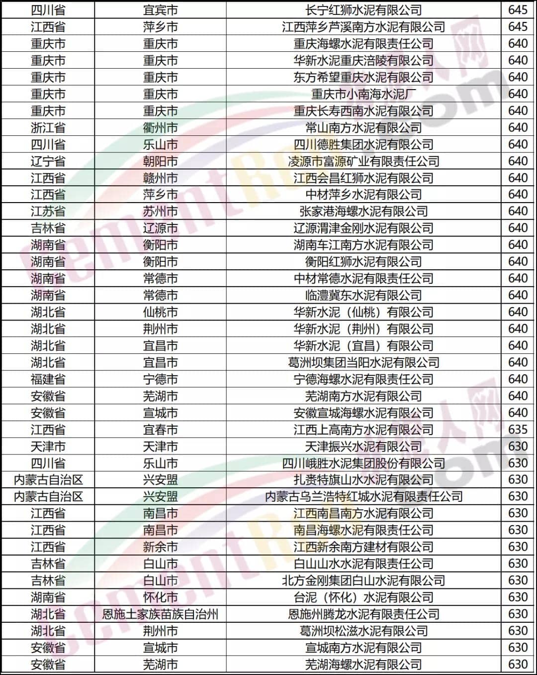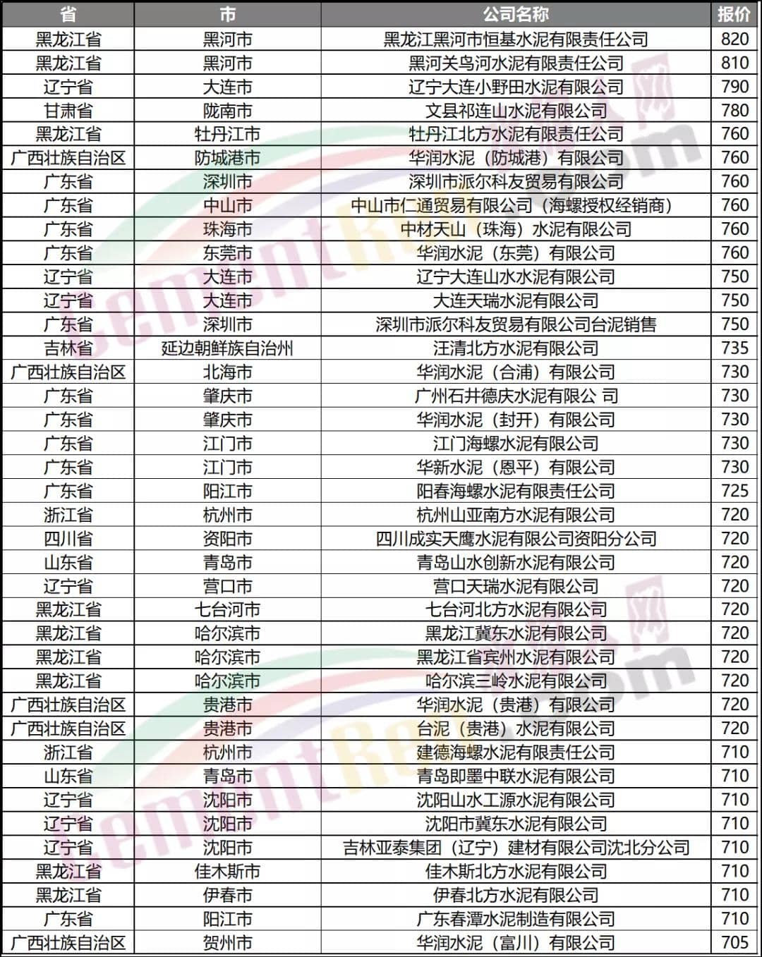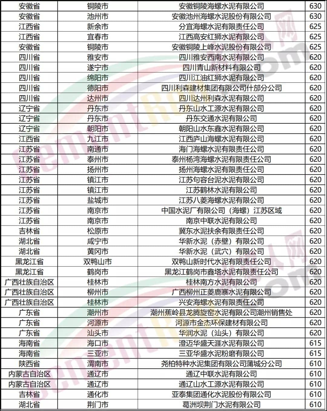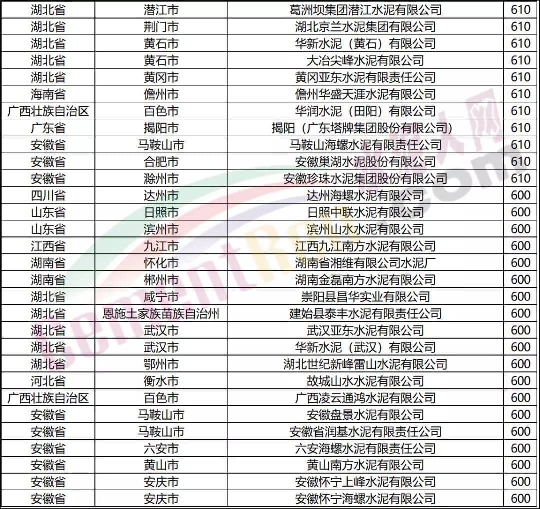 報(bào)價(jià)在600元/噸以上水泥企業(yè)名單