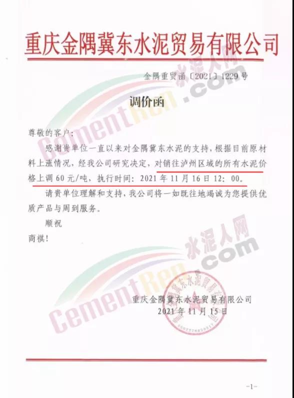 重慶金隅冀東水泥貿易有限公司通知,根據目前原材料上漲情況,經公司研究決定,對銷往瀘州區域的所有水泥價格上調60元/噸,執行時間2021年11月16日12:00。