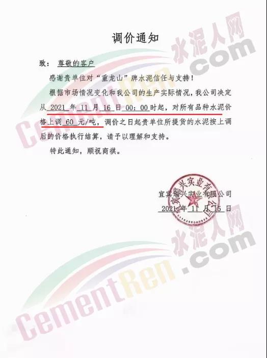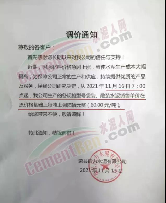榮縣自力水泥有限公司通知,因原材料價格急劇上漲,致使水泥生產成本大幅提高,為保障公司正常的生產和供應,持續提供優質的產品及服務,經公司研究決定,從2021年11月16日7點起,公司生產的各規格型號袋裝、散裝水泥銷售單價在原價格基礎上上調60元/噸。