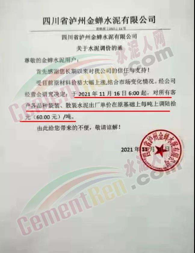 四川省瀘州金蟬水泥有限公司通知,受目前原材料價格大幅上漲影響,結合市場變化情況。經公司經營會研究決定于2021年11月16日6時起,對所有客戶各品種袋裝、散裝水泥出廠單價在原基礎上調60元/噸。
