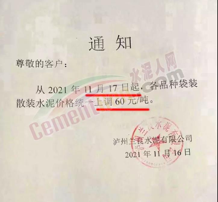 瀘州蘭良水泥有限公司通知,自11月17日起,各品種袋裝、散裝水泥價格統一上調60元/噸。