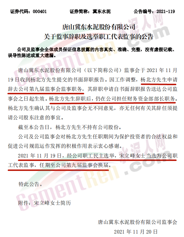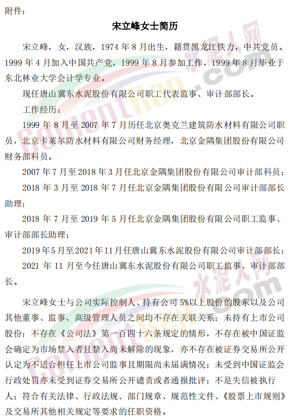 日前,冀東水泥發布《唐山冀東水泥股份有限公司關于監事辭職及選舉職工代表監事的公告》稱,楊北方先生申請辭去公司第九屆監事會監事職務,辭職后,仍在公司擔任財務資金部部長職務。經公司職工民主選舉,宋立峰女士當選為公司職工代表監事,任期至公司第九屆監事會換屆。具體公告如下: