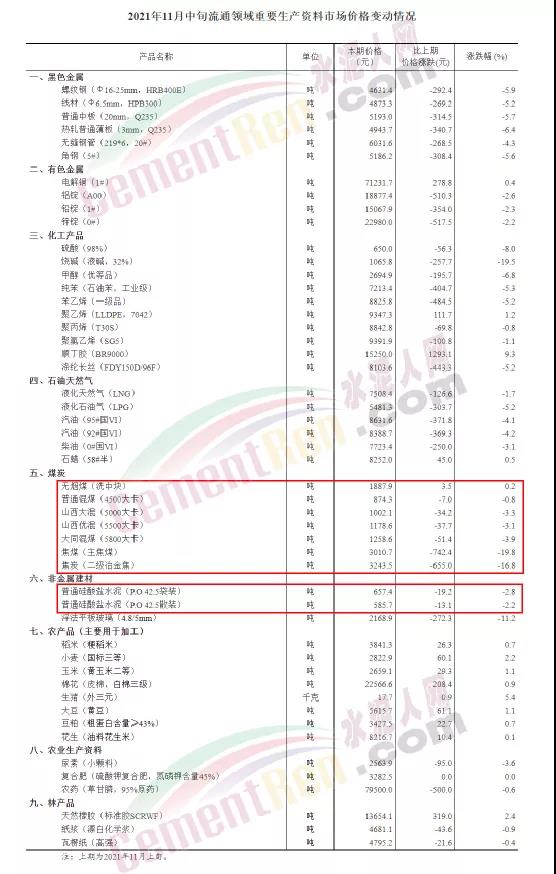 日前,國家統計局發布《2021年11月中旬流通領域重要生產資料市場價格變動情況,據對全國流通領域9大類50種重要生產資料市場價格的監測顯示,2021年11月中旬與11月上旬相比,14種產品價格上漲,35種下降,1種持平。其中,普通硅酸鹽水泥(P.O42.5散裝)均價585.7元/噸,較十一月上旬下跌13.1元/噸;普通硅酸鹽水泥(P.O42.5袋裝)報價657.4元,較上旬下跌19.2元/噸。