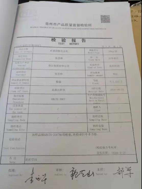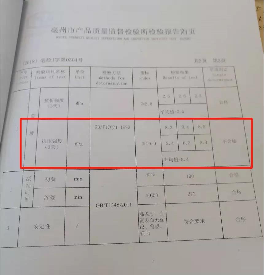 在此期間,消費(fèi)者通過質(zhì)量監(jiān)督檢測部門檢測,確認(rèn)水泥質(zhì)量不合格。檢驗報告如下: