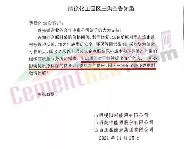 近日,一份名為《清徐化工園區三焦企告知函》的文件在網絡流傳。署名為山西梗陽新能源、山西亞鑫能源,以及A股上市公司美錦能源的三家焦化企業表示,若焦炭客戶繼續提降,勢必影響優質原料煤的儲備、優質焦炭的供應,將堅決予以抵制。