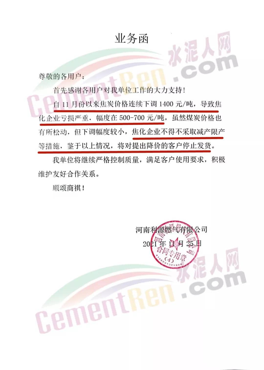 河南利源燃氣有限公司:自11月份以來焦炭價格連續下調1400元/噸,導致焦化企業虧損嚴重,幅度在500-700元/噸,雖然煤炭價格也有所松動,但下調幅度較小,焦化企業不得不采取減產限產等措施,鑒于以上情況,將對提出降價的客戶停止發貨。