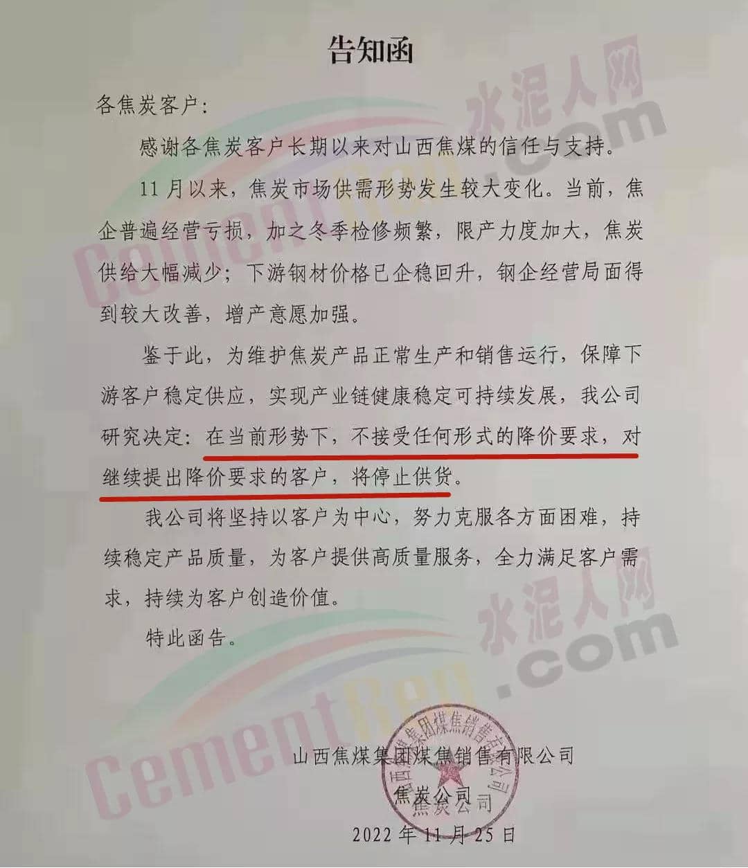 山西焦煤集團煤焦銷售有限公司:為維護焦炭產品正常生產和銷售運行,保障下游客戶穩定供應,實現產業鏈健康穩定可持續發展,研究決定:在當前形勢下,不接受任何形式的降價要求,對繼續提出降價要求的客戶,將停止供貨。