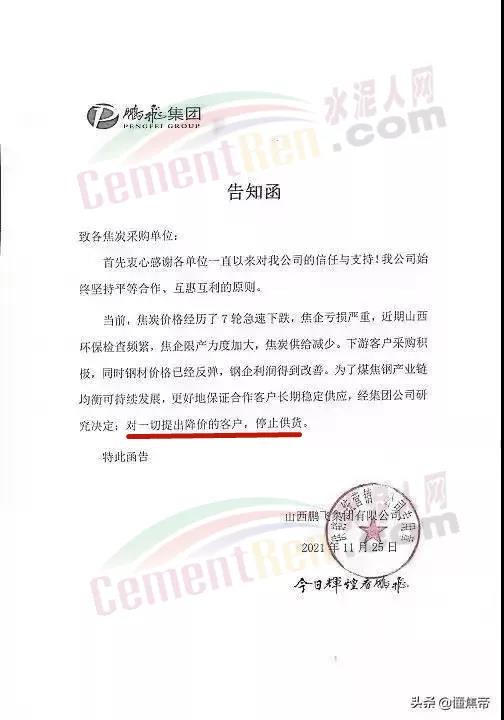山西鵬飛集團:為了煤焦鋼產業鏈均衡可持續發展,更好地保證合作客戶長期穩定供應,經集團公司研究決定:對一切提出降價的客戶,停止供貨。