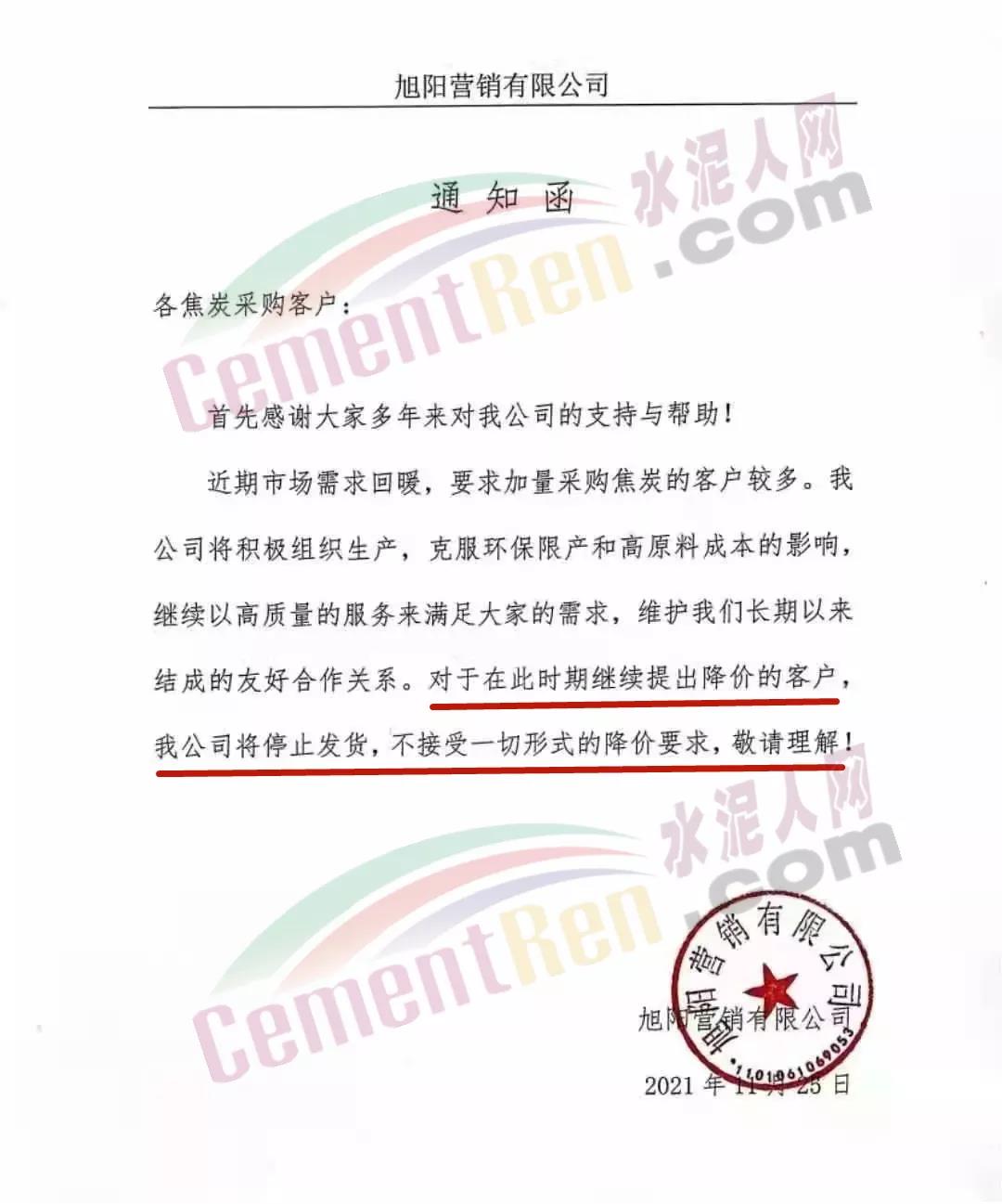 告知函中提到,近期鋼企(下游客戶)原料采購價格回落,利潤修復,與此同時,焦企(原料供應商)受原料煤市場止跌、部分煤種反彈等因素影響,虧損加大,因此堅決抵制降價。據水泥人網了解,近期發出這類告知函的企業不在少數,有些企業甚至明確,對于繼續提出降價的客戶停止發貨。