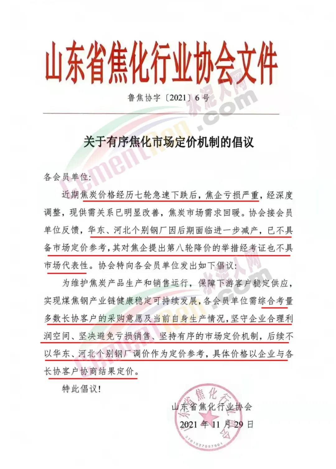 山東省焦化行業協會發出倡議文件稱,近期焦炭價格經歷七輪急速下跌后,焦企虧損嚴重,經深度調整,現供需關系已明顯改善,焦炭市場需求回暖。協會接會員單位反饋,華東、河北個別鋼廠因后期面臨進一步減產,已不具備市場定價參考,其對焦企提出第八輪降價的舉措經考證也不具市場代表性。協會特向各會員單位發出倡議∶