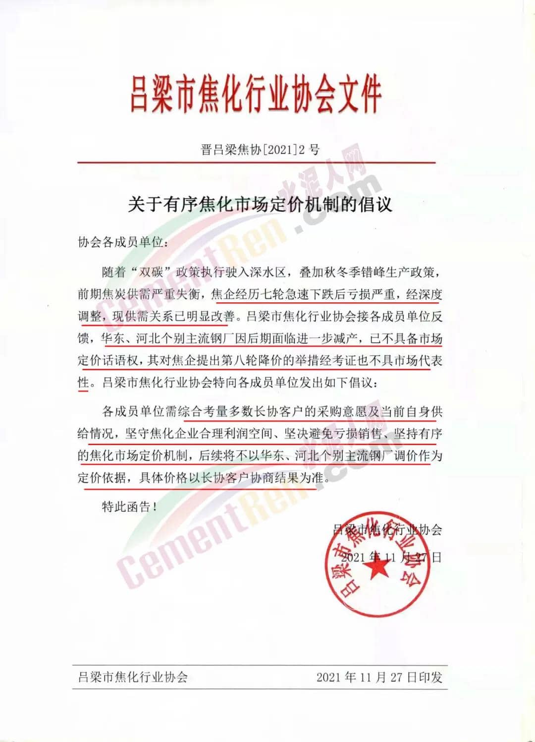 呂梁市焦化行業協會發布《關于有序焦化市場定價機制的倡議》稱,隨著"雙碳"政策執行駛入深水區,疊加秋冬季錯峰生產政策,前期焦炭供需嚴重失衡,焦企經歷七輪急速下跌后虧損嚴重,經深度調整,現供需關系已明顯改善。呂梁市焦化行業協會接各成員單位反饋,華東、河北個別主流鋼廠因后期面臨進一步減產,已不具備市場定價話語權,其對焦企提出第八輪降價的舉措經考證也不具市場代表性。