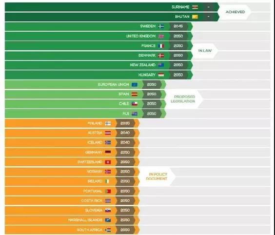 “碳中和、碳達峰”是全球各國的共識,目前已有數十個國家和地區提出了“零碳”或“碳中和”的氣候目標,Energy & Climate Intelligence Unit 的凈零排放跟蹤表統計了各個國家進展情況,包括:已實現的2個國家,已立法的6個國家,處于立法中狀態的包括歐盟(作為整體)和其他3個國家。