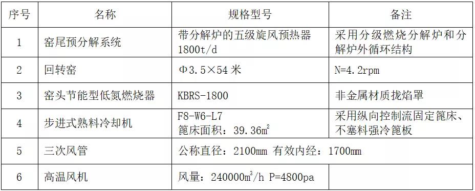 據科邦高級工程師郭紅軍介紹,采用這項技術的水泥廠,設計生產規模為1800t/d,配備Φ3.5*54米回轉窯,窯尾采用帶分解爐的五級旋風預熱器,采用升級型的第四代步進式篦冷機,窯頭采用節能型低氮燃燒器。燒成系統主要設備配置情況見下表: