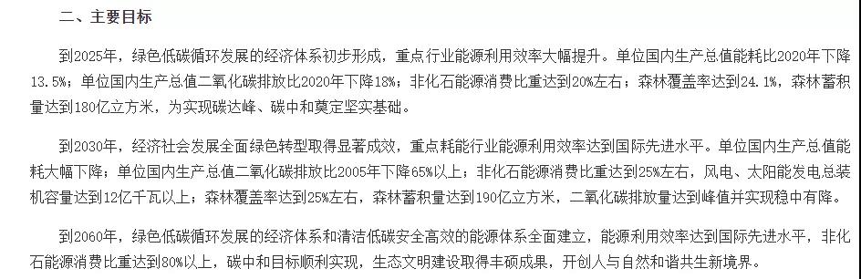 日前,中共中央、國務院印發的《關于完整準確全面貫徹新發展理念做好碳達峰碳中和工作的意見》正式發布,《意見》提出到2025年,綠色低碳循環發展的經濟體系初步形成,重點行業能源利用效率大幅提升;到2030年,經濟社會發展全面綠色轉型取得顯著成效,重點耗能行業能源利用效率達到國際先進水平;到2060年,綠色低碳循環發展的經濟體系和清潔低碳安全高效的能源體系全面建立,能源利用效率達到國際先進水平的主要目標。