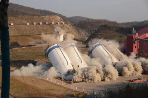 當天下午,在成功安裝炸藥后,5個建筑物在10秒鐘之內(nèi)先后被起爆。記者看到,隨著一陣灰塵涌起,5個“龐然大物”轟然倒下,揚起的灰塵也很快“偃旗息鼓”,整個爆破過程在半分鐘內(nèi)結(jié)束。
