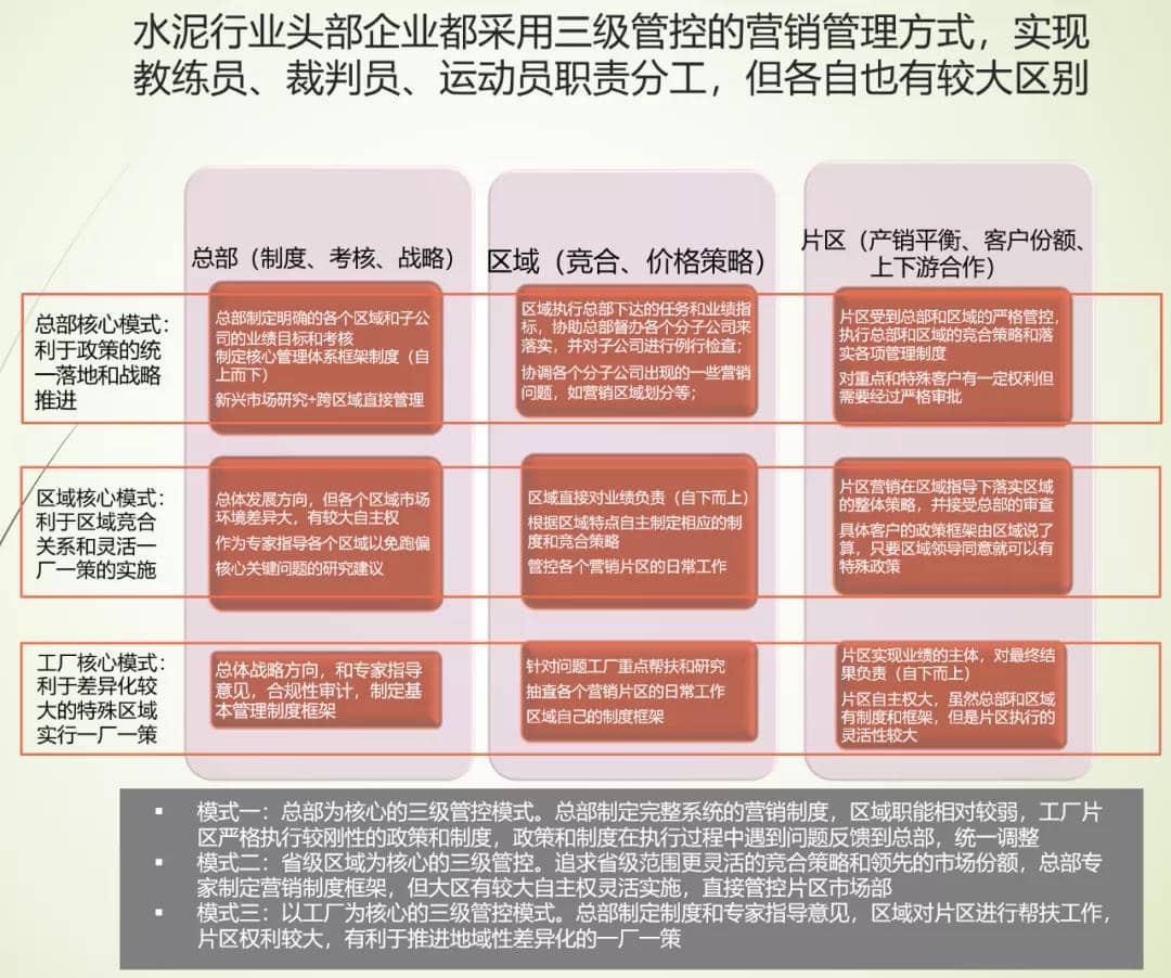 水泥營銷管理框架的核心是營銷管理三級管控體系。這三級包括總部、區域和片區,分別扮演著教練員、裁判員和運動員的角色職能。它們既有專業分工和不同側重,同時又能夠整體上協調一致和形成合力。水泥行業頭部企業雖然普遍采用三級管控模式,但是因不同企業的市場環境不同、戰略方向和定位不同、營銷目標和管理思路不同,造成總部、區域和片區,這三級的具體職能設置和管控方式有較大的差異。大體來說分為以下三種模式: