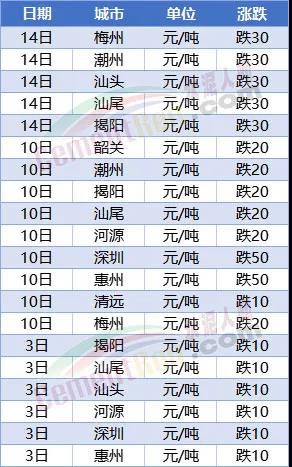 近期華南區域下游需求低迷疊加周邊水泥低價沖擊市場,為穩定銷量區域內主要品牌企業持續下調水泥價格,其中梅州區域自10月下旬以來已經連續八輪下調水泥價格,累計跌價165元/噸。