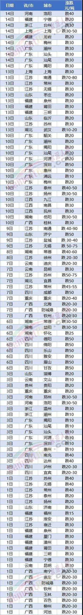 同期周邊江蘇、浙江區域同步下調水泥價格。其中江蘇蘇州本月內已累計三次下調,分別于1日下調30元/噸,7日下調50-75元/噸,13日再次下調30元/噸;11月分別于23日下跌20元/噸,11日下跌30元/噸,累計下跌近200元/噸。