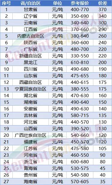 水泥人網信息中心監控數據顯示:甘肅省內各企業P.O42.5散裝水泥報價在400-770元/噸之間,高低價之間相差達370元/噸。遼寧省參考報價在350-690元/噸之間,高低價之間相差340元/噸。云南省參考報價在340-640元/噸之間,高低價之間相差300元/噸。