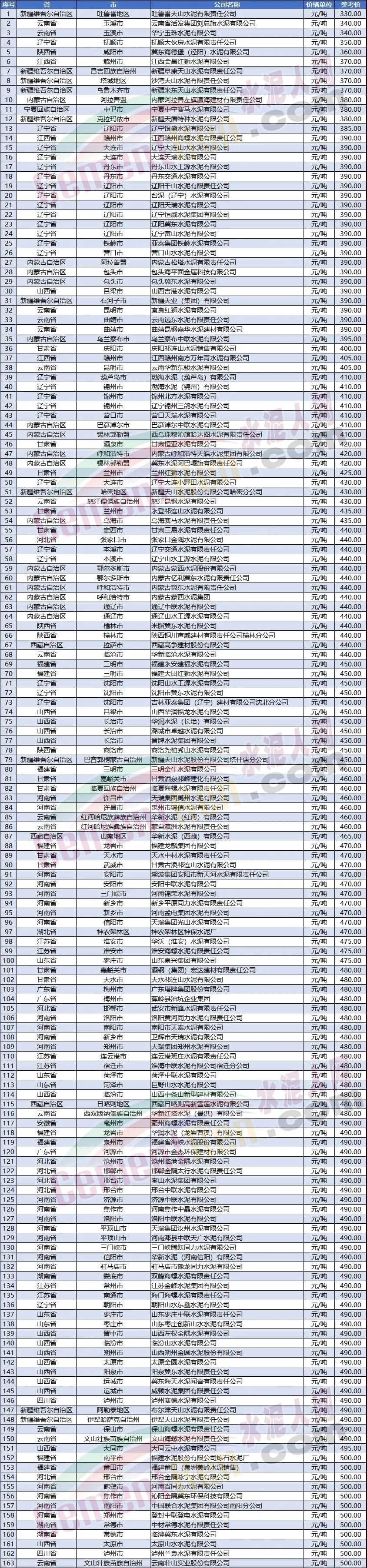 部分區域P.O42.5散裝水泥參考報價及區域各品牌價差一覽: