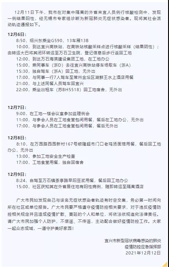日前 ,江蘇宜興市通報發(fā)現(xiàn)一例新冠肺炎無癥狀感染者。通報顯示,該感染者6日從浙江紹興到宜興,期間在萬石海濱建設集團工地等區(qū)域活動,從其活動軌跡可見,該感染者曾參加監(jiān)理例會和工地安全生產檢查。經(jīng)排查,密切接觸者共63人,次密切接觸者共560人。全部集中隔離并規(guī)范開展核酸檢測,已出結果均為陰性。