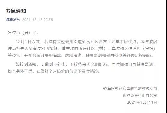 繼江蘇宜興之后,浙江寧波同一工地13人確診。浙江寧波鎮(zhèn)海區(qū)發(fā)布緊急通知,要求自12月1日以來,有去過蛟川街道虹橋社區(qū)四方工地集中居住點,或與該居住點相關人員有過密切接角的人員主動向所在社區(qū)(村)、單位和入住酒店(賓館)等報告 。