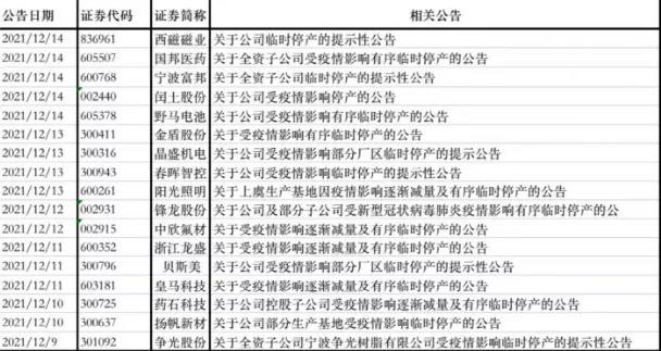 12月13日0-24時,新增確診病例45例,其中杭州市2例、寧波市4例、紹興市38例、境外輸入1例(剛果金輸入),已排查密切接觸者均已實施集中隔離。浙江全省已累計納入隔離管控540430人,其中集中隔離52824人,居家健康觀察21835人,日常健康監(jiān)測465771人。近20家A股上市企業(yè)發(fā)布停產公告,且未明確復產時間。