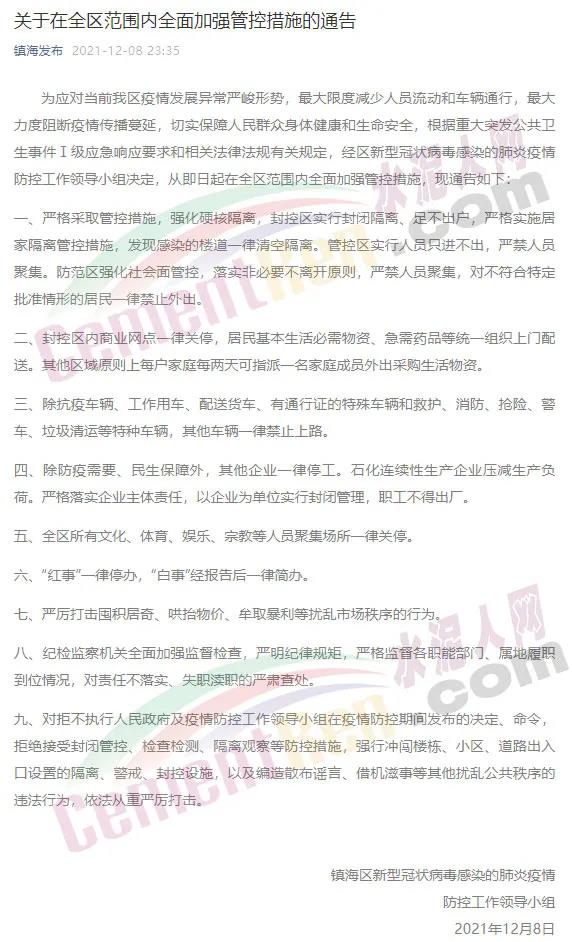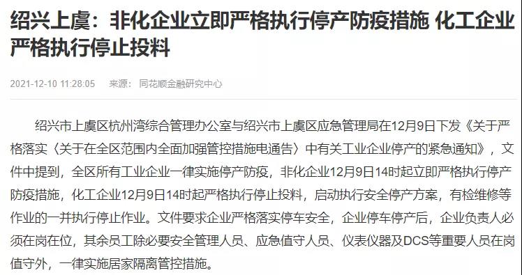 全區(qū)所有工業(yè)企業(yè)一律實施停產防疫,非化企業(yè)12月9日14時起立即嚴格執(zhí)行停產防疫措施,化工企業(yè)12月9日14時起嚴格執(zhí)行停止投料,啟動執(zhí)行安全停產方案,有檢維修等作業(yè)的一并執(zhí)行停止作業(yè)。