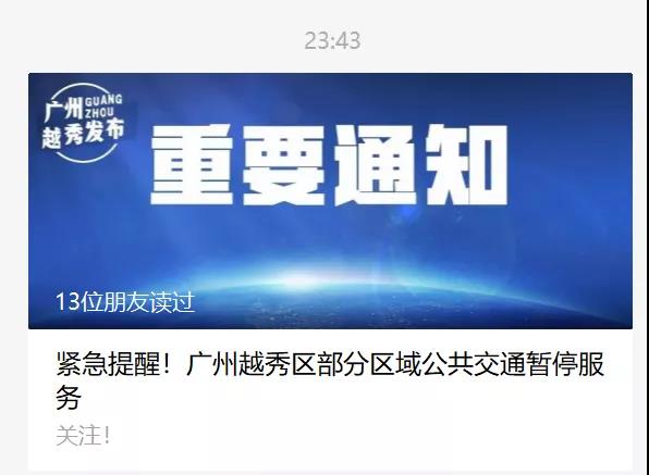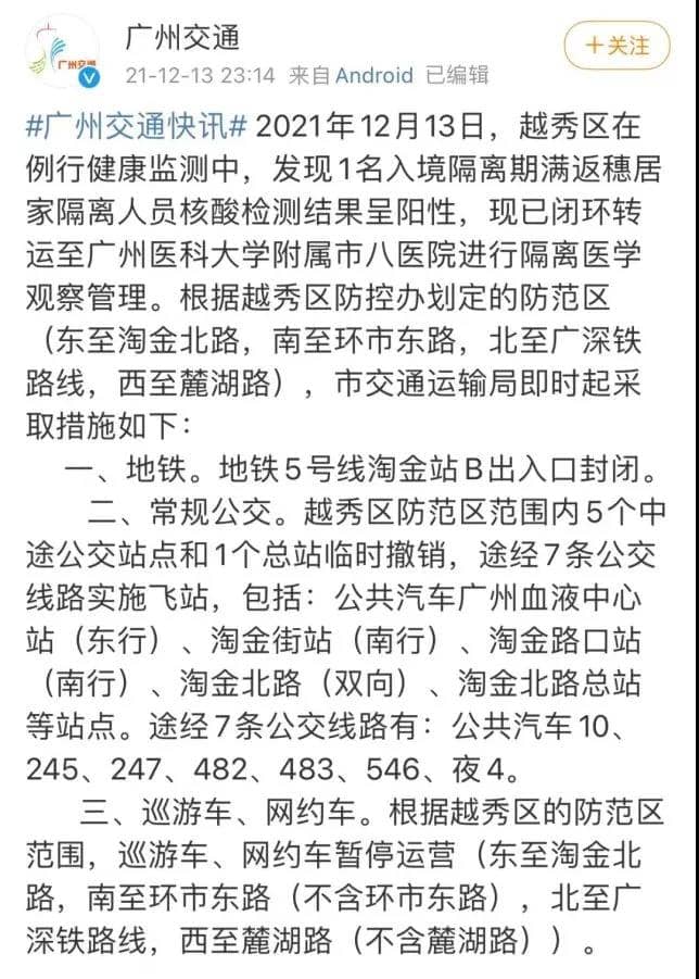 廣州越秀區(qū)部分區(qū)域公共交通暫停服務。根據(jù)越秀區(qū)防控辦劃定的防范區(qū)(東至淘金北路,南至環(huán)市東路,北至廣深鐵路線,西至麓湖路),廣州市交通運輸局即時起采取措施如下:
