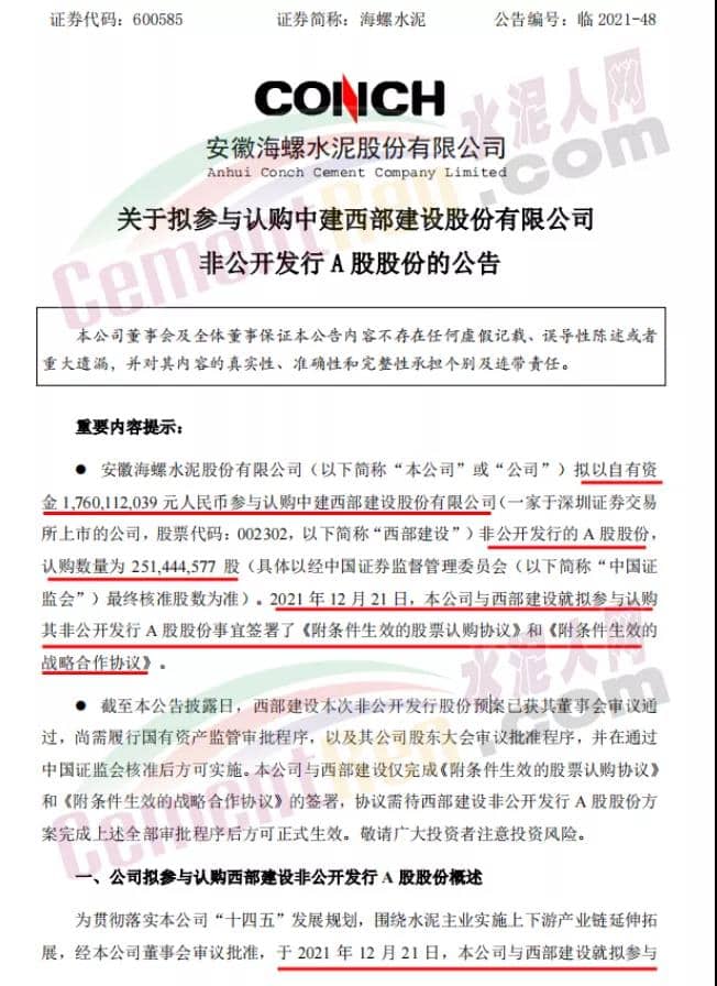 海螺水泥公告稱,為貫徹落實本公司“十四五”發(fā)展規(guī)劃,圍繞水泥主業(yè)實施上下游產(chǎn)業(yè)鏈延伸拓展,經(jīng)本公司董事會審議批準,于2021年12月21日,本公司與西部建設(shè)就擬參與認購其非公開發(fā)行股份事宜簽署了《附條件生效的股票認購協(xié)議》和《附條件生效的戰(zhàn)略合作協(xié)議》。西部建設(shè)是國內(nèi)領(lǐng)先的建材產(chǎn)業(yè)綜合服務(wù)商,也是國內(nèi)商品混凝土行業(yè)的領(lǐng)軍企業(yè),本公司擬通過認購其非公開發(fā)行A股股份的方式,進一步加強雙方在原材料供銷、混凝土業(yè)務(wù)、砂石骨料業(yè)務(wù)、物流運輸、產(chǎn)業(yè)互聯(lián)網(wǎng)等方面的戰(zhàn)略合作。