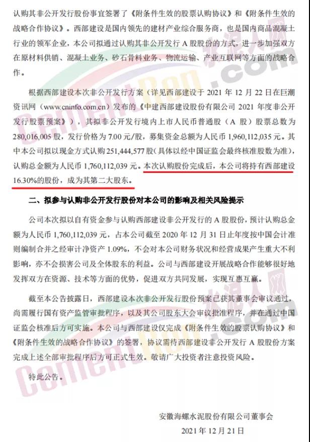 海螺水泥12月21日晚間公告,擬以自有資金約17.6億元人民幣參與認購西部建設(shè)非公開發(fā)行的A股股份,認購數(shù)量為2.51億股。本次認購股份完成后,本公司將持有西部建設(shè)16.3%的股份,成為其第二大股東。