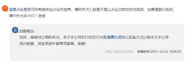 西部建設(shè)回復(fù)稱,本次非公開發(fā)行的發(fā)行對象海螺水泥將以現(xiàn)金方式認(rèn)購本次非公開發(fā)行股票,資金來源于自有或自籌。