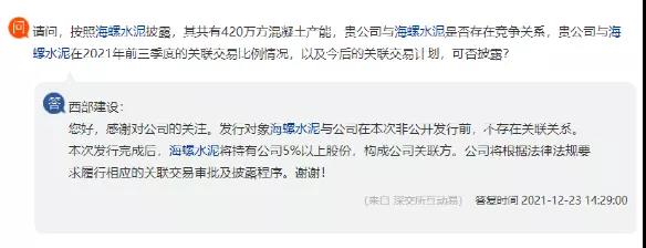 西部建設(shè)回復(fù)稱,海螺水泥與公司在本次非公開發(fā)行前,不存在關(guān)聯(lián)關(guān)系。本次發(fā)行完成后,海螺水泥將持有公司5%以上股份,構(gòu)成公司關(guān)聯(lián)方。