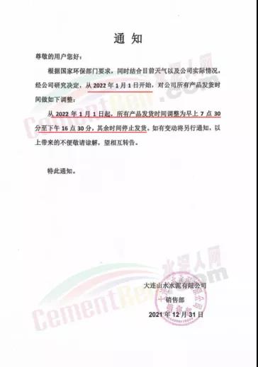 日前大連山水水泥有限公司通知,根據國家環(huán)保部門要求,同時結合目前天氣以及公司實際情況,經公司研究決定,從2022年1月1日開始,對公司所有產品發(fā)貨時間做出調整:從2022年1月1日起,所有產品發(fā)貨時間調整為早上7點 30分至下午16點30分,其余時間停止發(fā)貨。