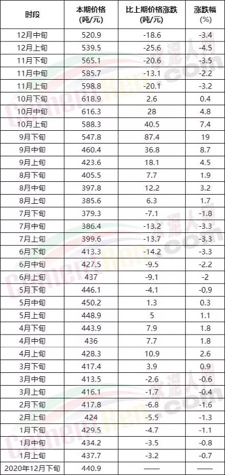 2021年1月、2月上旬和下旬、3月中上旬、5月下旬、6月、7月、11月、12月中上旬水泥價格均有不同幅度的下跌;3月下旬、4月、5月中上旬、8月、9月、10月有不同幅度的上漲。