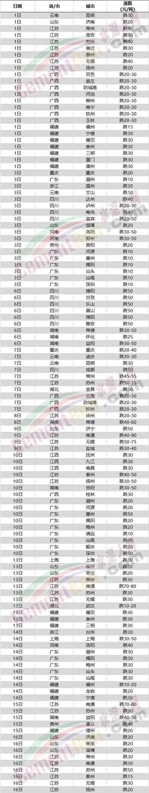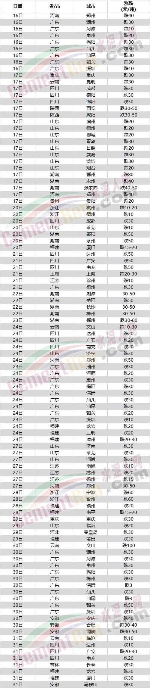 部分區(qū)域P.O42.5散裝水泥跌價情況一覽(2021年12月)