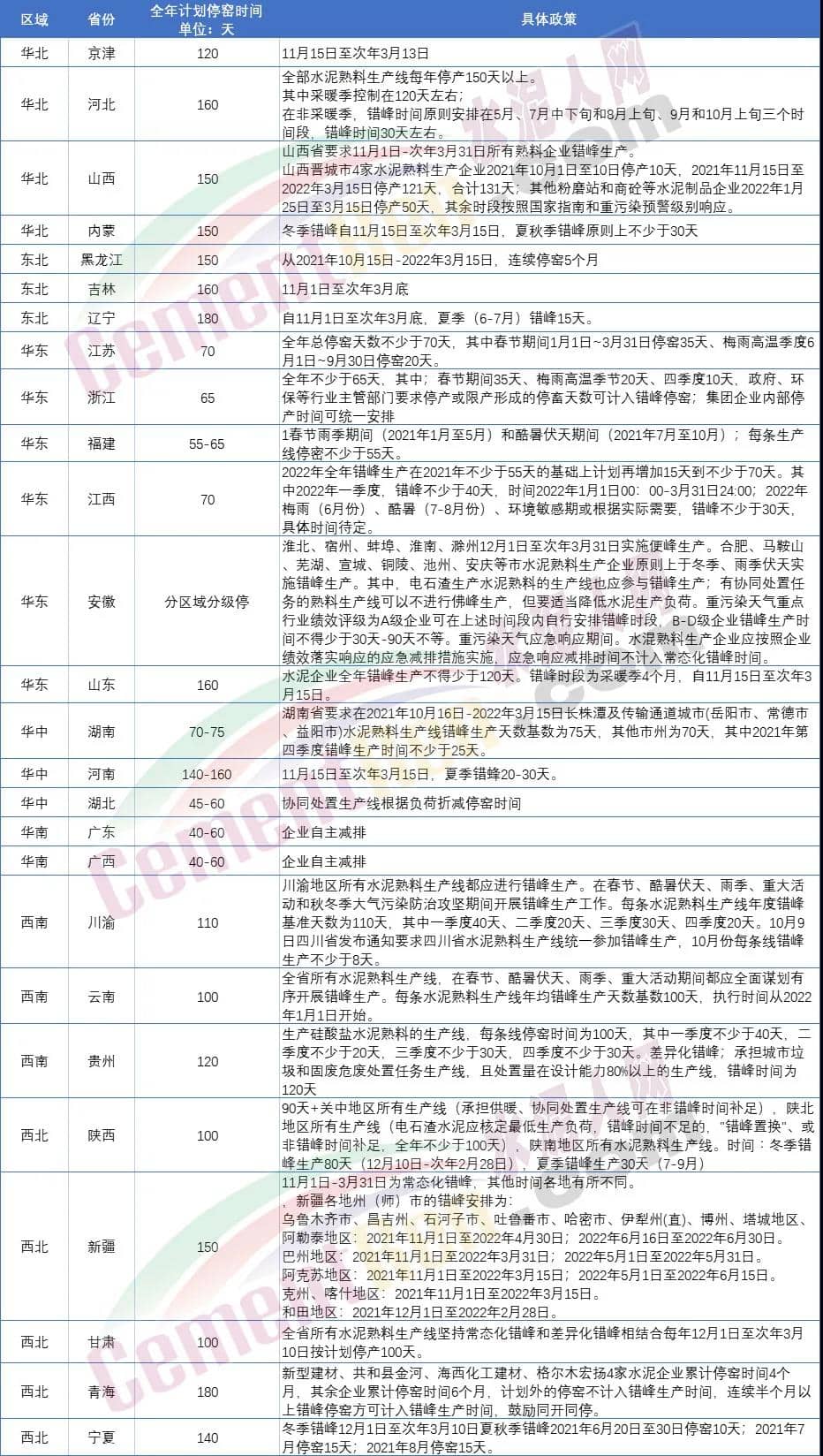 應(yīng)工信部、生態(tài)環(huán)境部兩部委關(guān)于進(jìn)一步做好水泥常態(tài)化錯峰生產(chǎn)的通知要求,絕大部分省份都提前發(fā)布了2022年全年錯峰生產(chǎn)計劃,全年停產(chǎn)基準(zhǔn)天數(shù)最長達(dá)到180天。