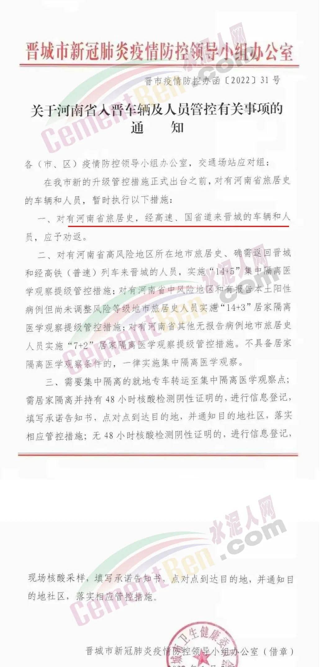 晉城市疫情防控辦發(fā)布從嚴(yán)從緊升級管控措施。禁止河南省來往晉城的縣鄉(xiāng)村級道路通行。勸返有河南省旅居史,經(jīng)高速、國省道和高鐵(普速)列車來晉城的外省車輛及人員。熔斷河南省往返晉城的貨運(yùn)物流、冷鏈物流、公路客運(yùn)(包括出租車、網(wǎng)約車、順風(fēng)車、團(tuán)隊(duì)包車等)業(yè)務(wù)。