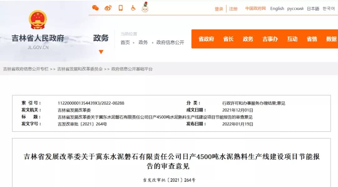 你局《關于申請審查冀東水泥磐石有限責任公司日產(chǎn)4500噸水泥熟料生產(chǎn)線建設項目節(jié)能報告的請示》(磐發(fā)改請字﹝2021﹞29號)收悉。該項目(項目代碼:2103-220284-07-01-120516)總投資141801.96萬元,總用地面積656000平方米,總建筑面積91377.64平方米,共建設建筑物12座,淘汰日產(chǎn)2500噸低效熟料生產(chǎn)線1條,新建日產(chǎn)熟料4500噸新型干法水泥生產(chǎn)線1條,同步配套建設9MW低溫余熱發(fā)電系統(tǒng)、脫硝工程、脫硫工程及60萬噸/年礦渣磨粉生產(chǎn)線,購置設備共計6418臺(套)。項目建成后可年產(chǎn)熟料139.5萬噸、水泥195萬噸。根據(jù)吉林省節(jié)能評審中心《關于報送<冀東水泥磐石有限責任公司日產(chǎn)4500噸水泥熟料生產(chǎn)線建設項目節(jié)能報告評審意見>的報告》(吉能評﹝2021﹞66號),經(jīng)審查,具體意見如下:
